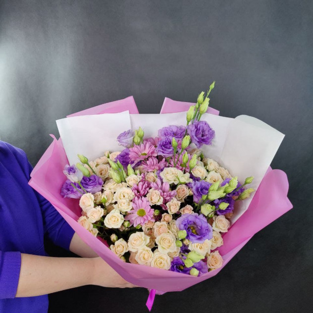 Очень милый букет из хризантем, кустовых роз и эустомы. Прекрасно подойдет на любое торжество.