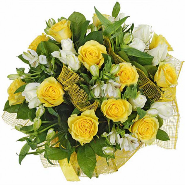 Роза белая 60 см 12шт., Упаковка для букета: натуральная сетка-джут, Альстромерия 7шт., Салал 10шт., Роза желтая 60 см 13шт.