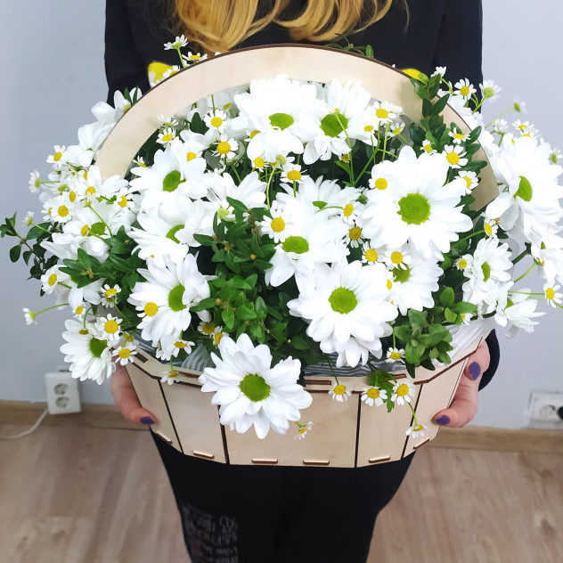 Пышная, ароматная корзина из полевой ромашки и хризантемы. Она восхитительна и однозначно порадует получателя!