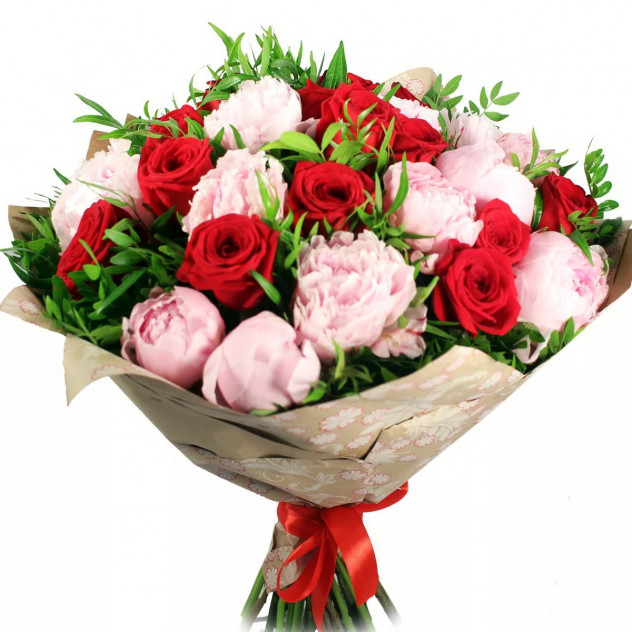 Упаковка для букета: крафт-бумага, Фисташка 5шт., Роза красная 60 см 15шт., Пион 14шт.