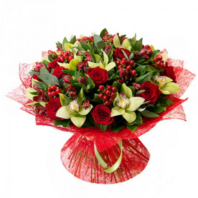 Состав: Роза красная 60 см 11шт., Орхидея цимбидиум (колокольчик) 11шт., Упаковка для букета: сезаль, Альстромерия 7шт., Гиперикум 7шт., Рускус 30шт.