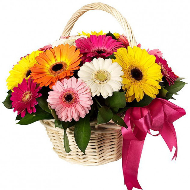 Состав: Упаковка для букета: прозрачная пленка с лентой, Гербера 15шт., Рускус 20шт., Корзина плетеная, Пиафлор (оазис)